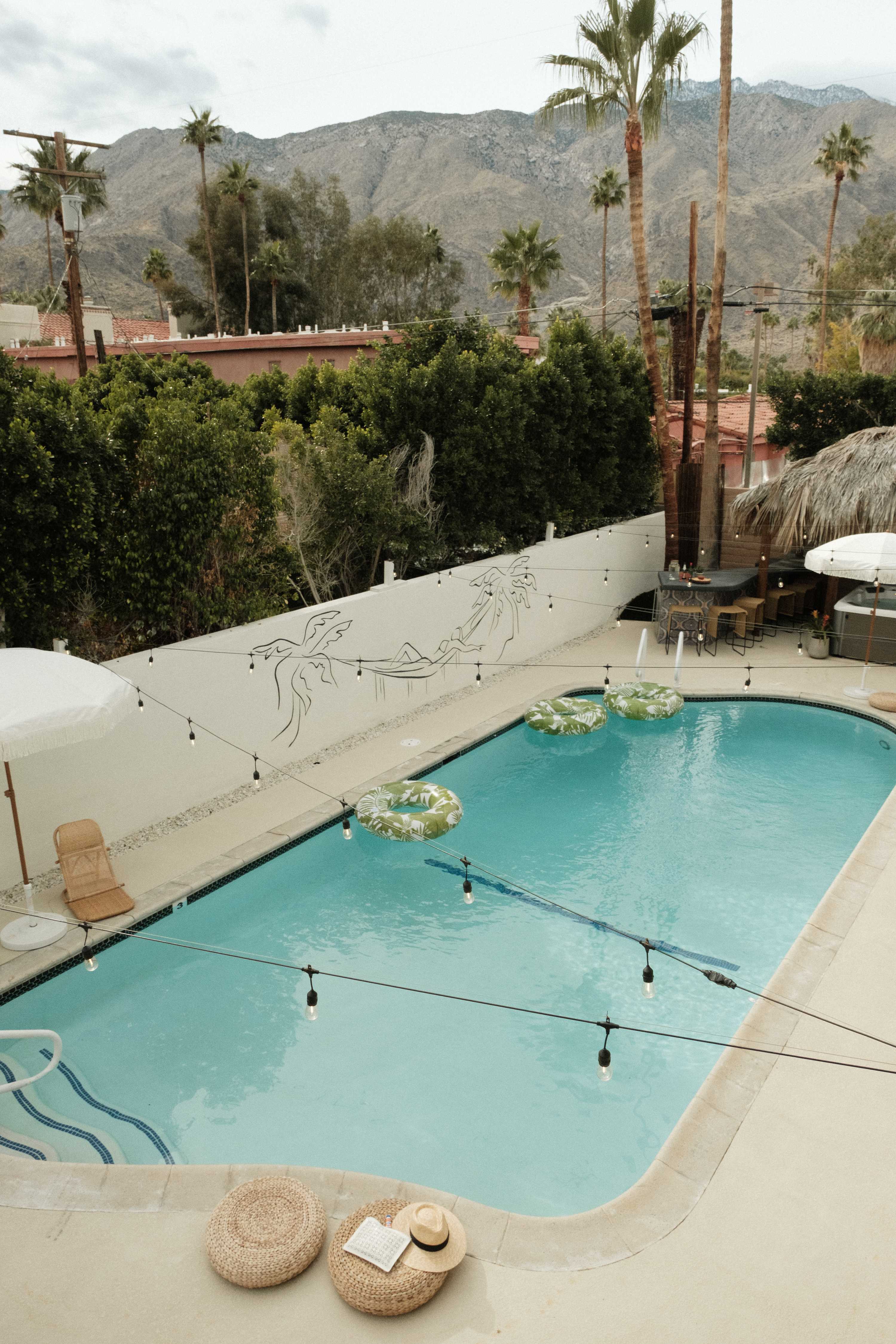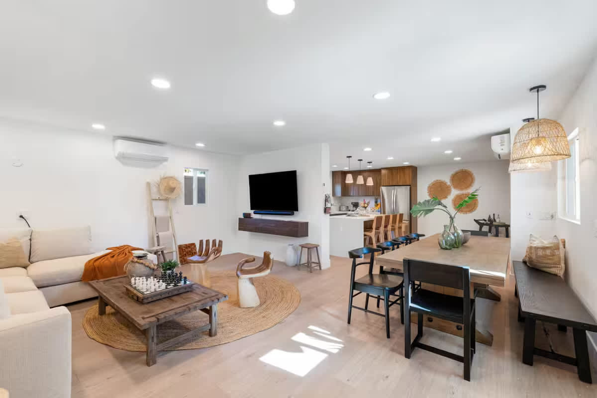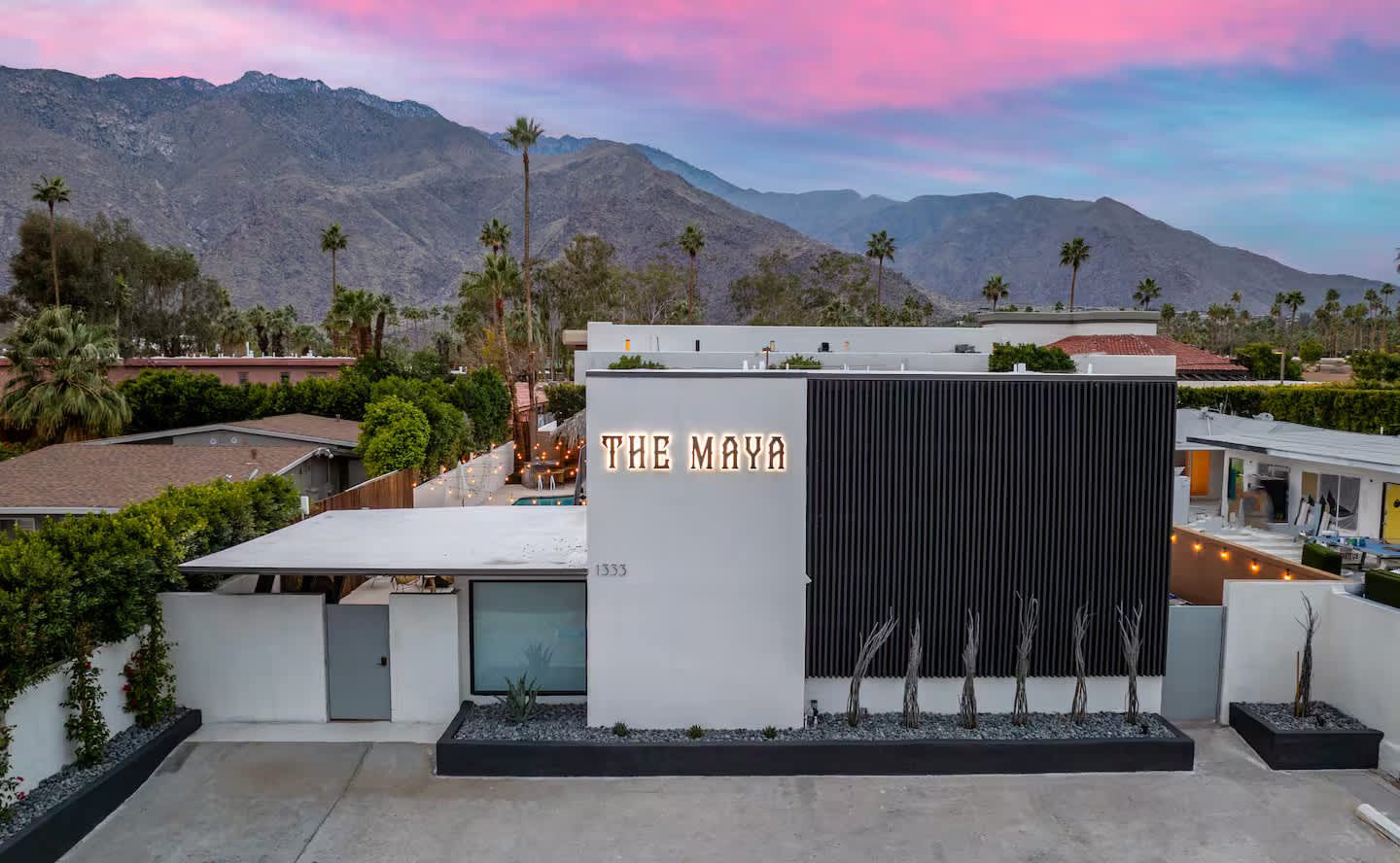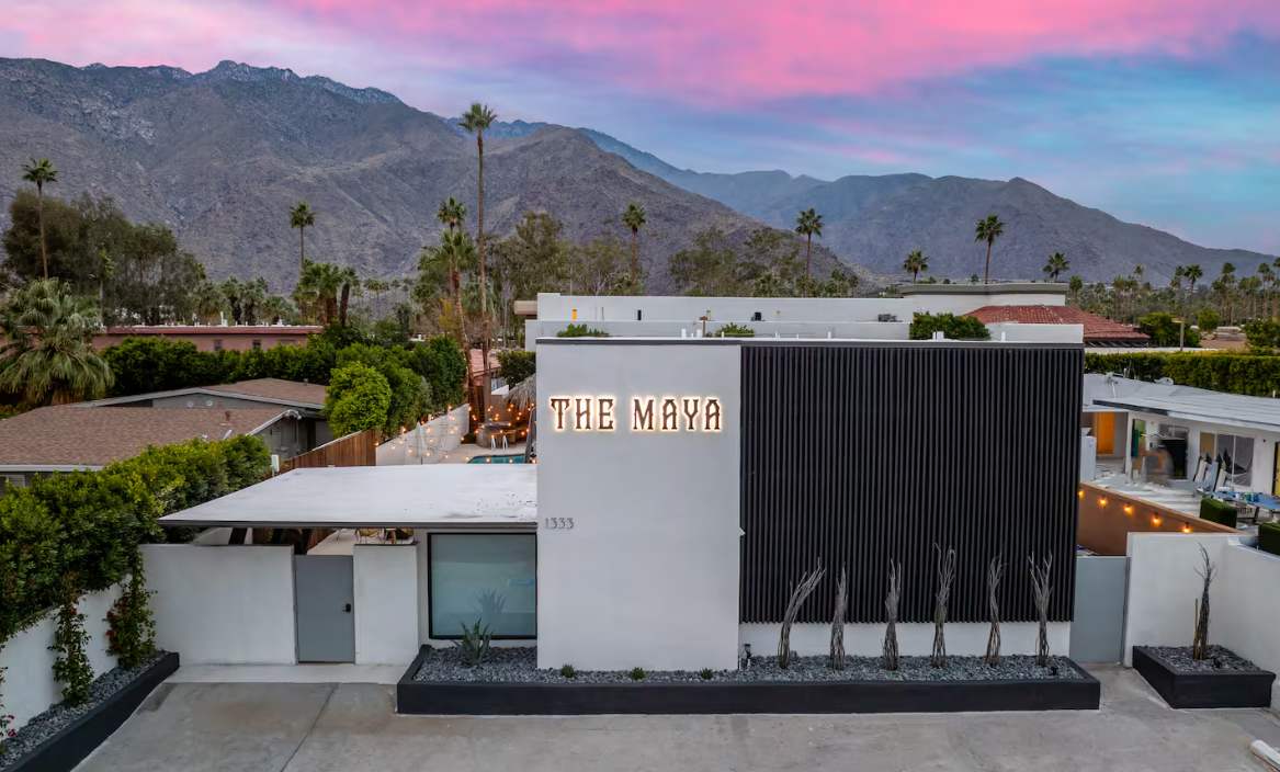 Welcome to The Maya, your exclusive desert retreat in Palm Springs! - Boho-inspired rooms with king-size beds and en-suite bathrooms. - Cozy lounges create a tranquil sanctuary for relaxation. - Family-friendly options with playful bunk beds. - Spacious community room with a sectional, 60-inch TV, and gourmet kitchen. - Fully equipped gym for fitness enthusiasts. - Engaging game room with pool tables and video games. - Stunning views of the desert and mountains.