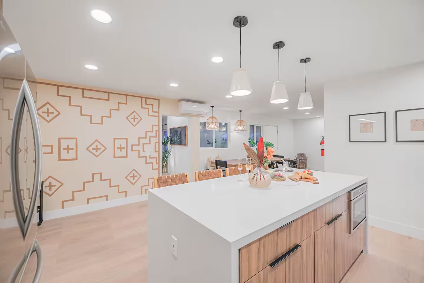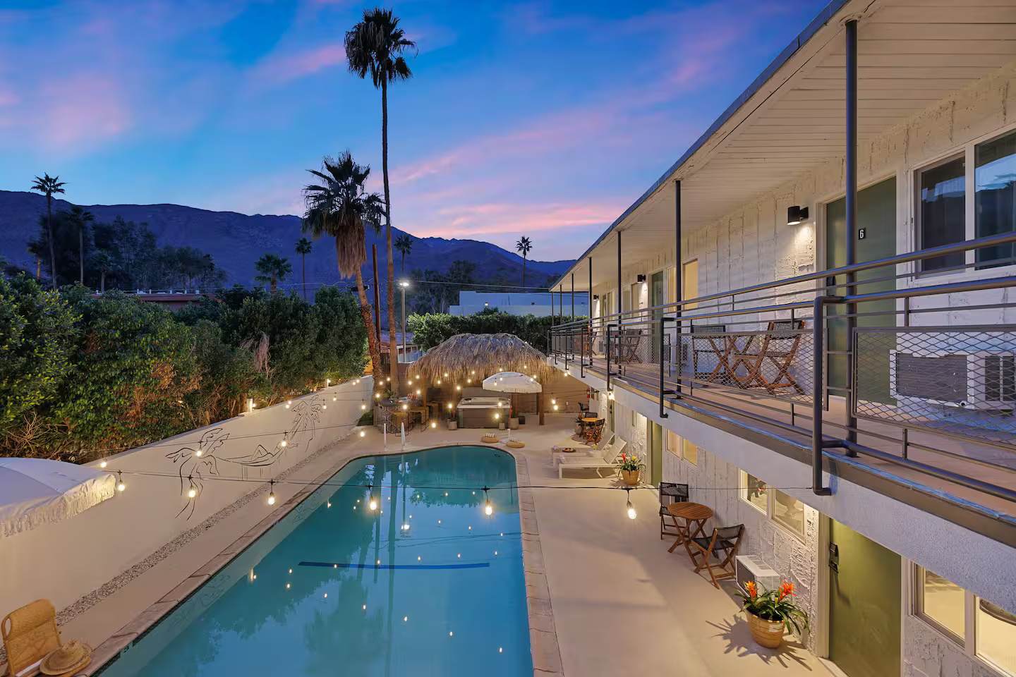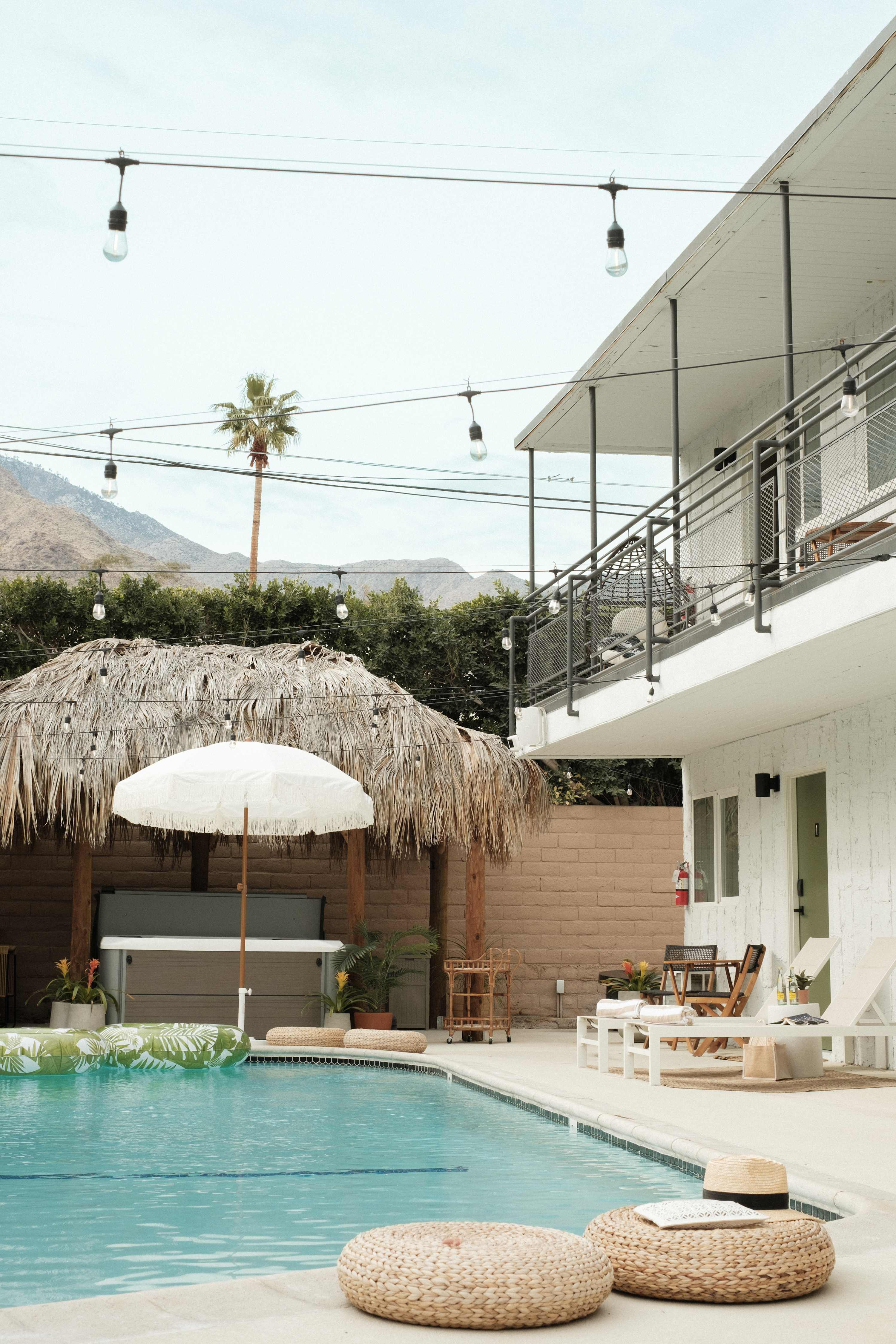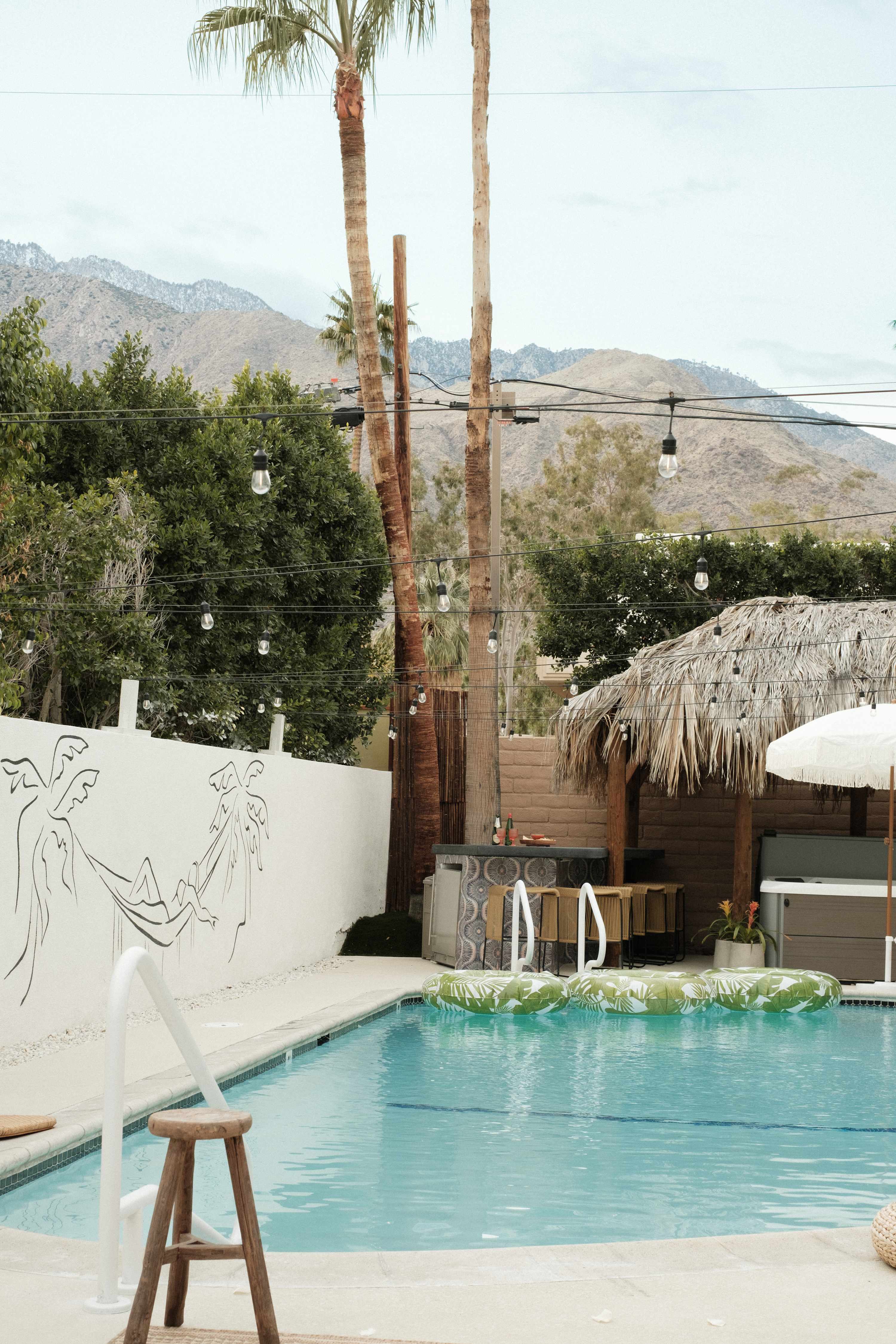 Welcome to The Maya, your exclusive desert retreat in Palm Springs! - Boho-inspired rooms with king-size beds and en-suite bathrooms. - Cozy lounges create a tranquil sanctuary for relaxation. - Family-friendly options with playful bunk beds. - Spacious community room with a sectional, 60-inch TV, and gourmet kitchen. - Fully equipped gym for fitness enthusiasts. - Engaging game room with pool tables and video games. - Stunning views of the desert and mountains.