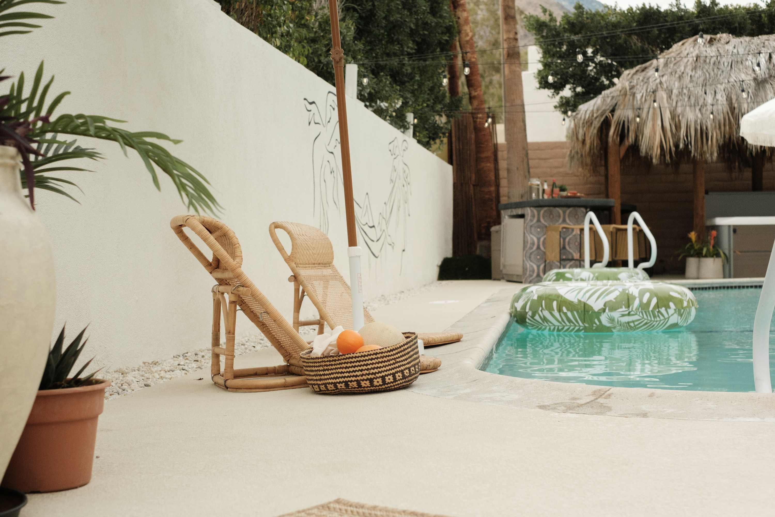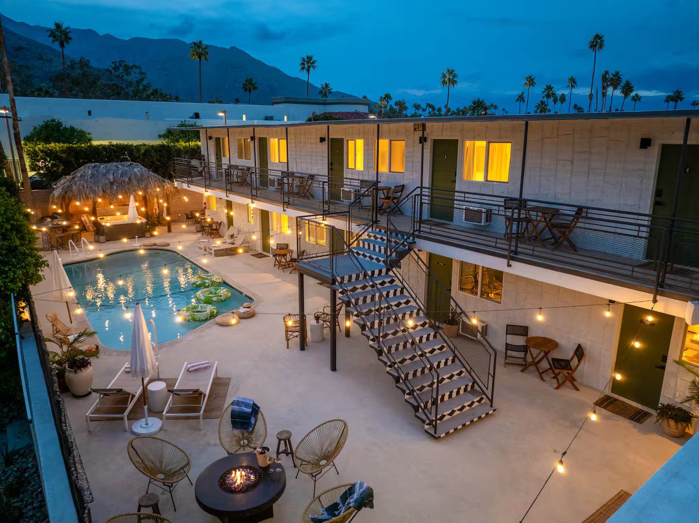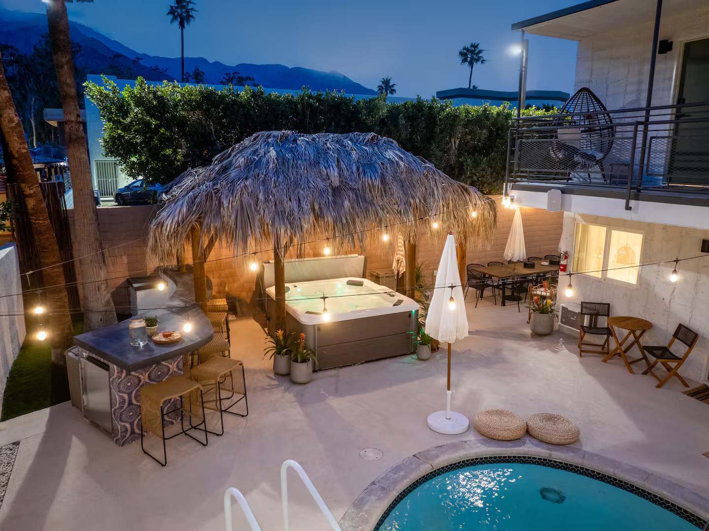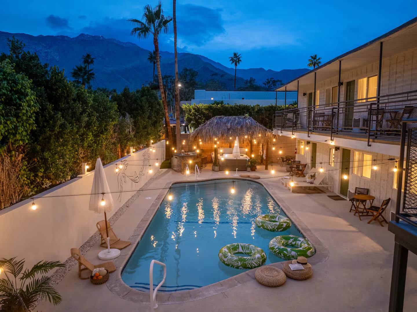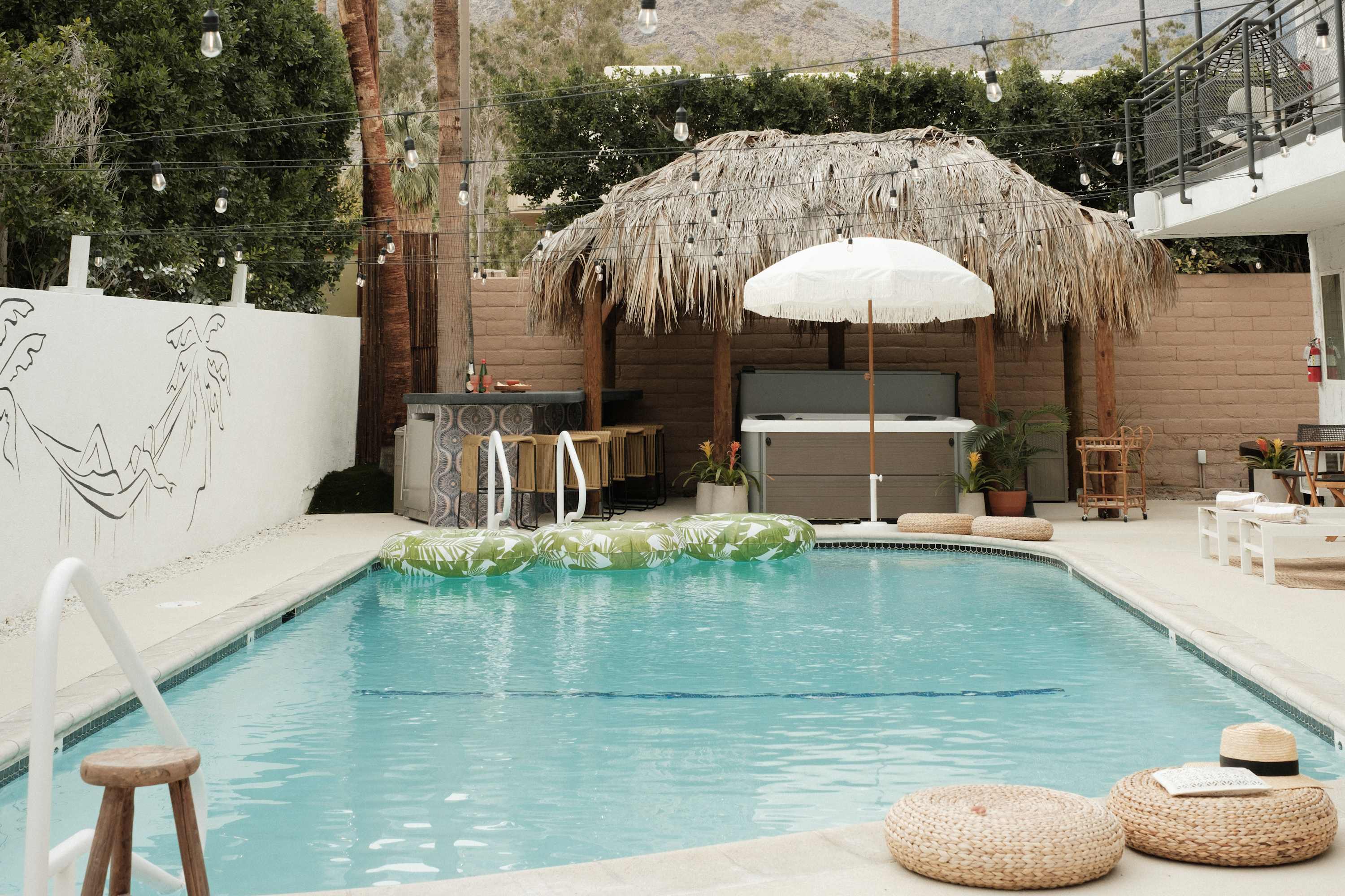 Welcome to The Maya, your exclusive desert retreat in Palm Springs! – Boho-inspired rooms with king-size beds and en-suite bathrooms. – Cozy lounges create a tranquil sanctuary for relaxation. – Family-friendly options with playful bunk beds. – Spacious community room with a sectional, 60-inch TV, and gourmet kitchen. – Fully equipped gym for fitness enthusiasts. – Engaging game room with pool tables and video games. – Stunning views of the desert and mountains.