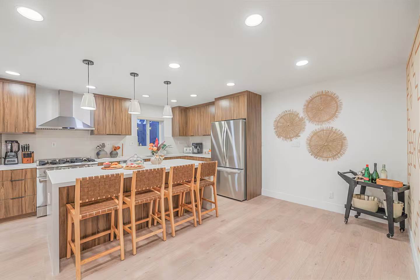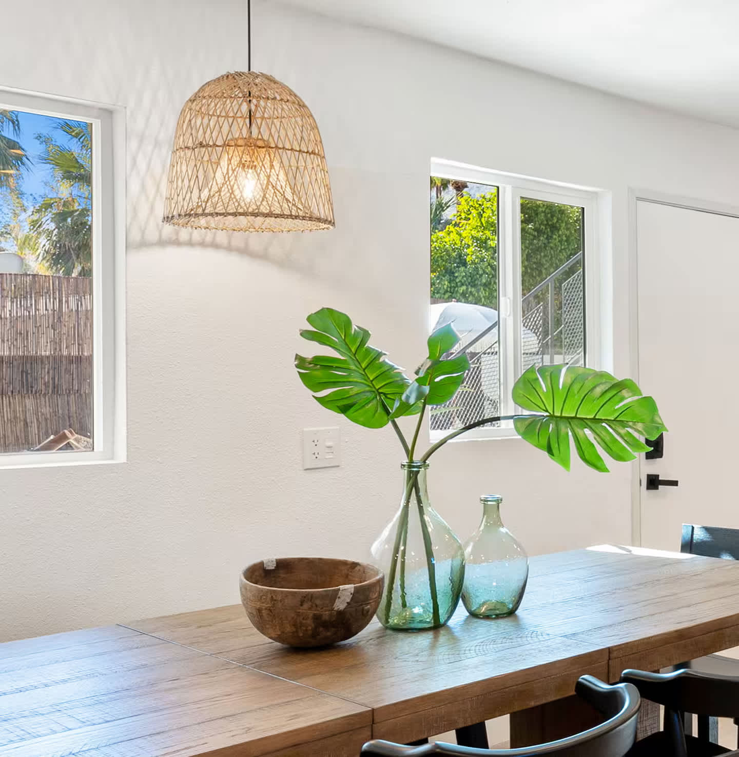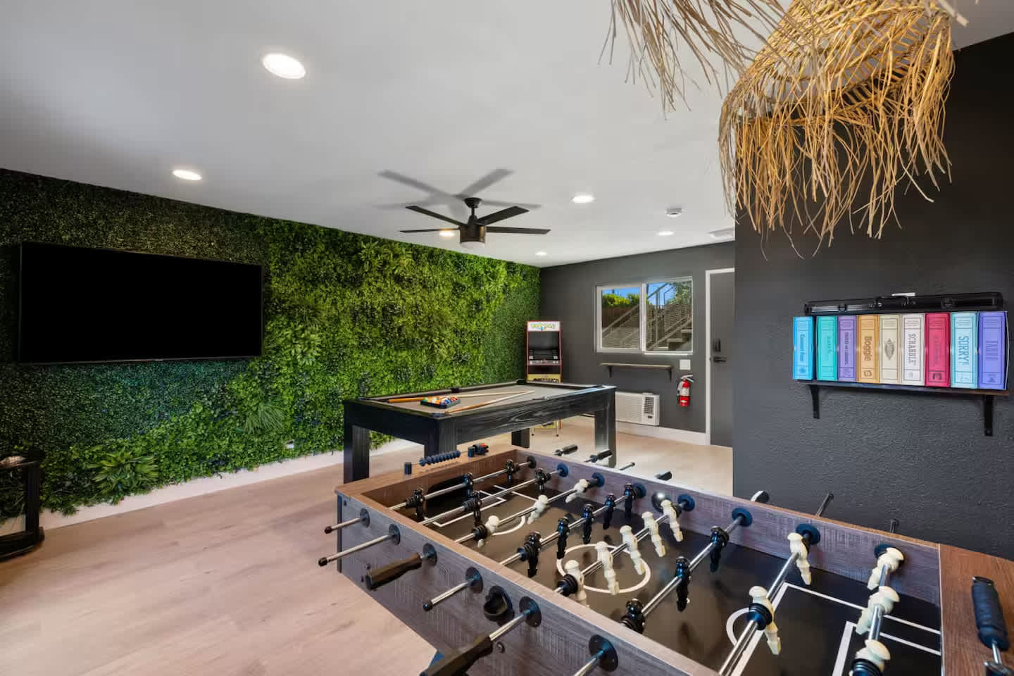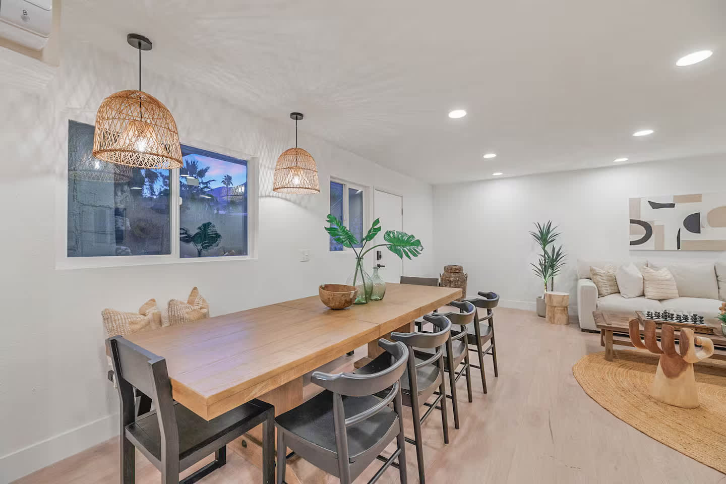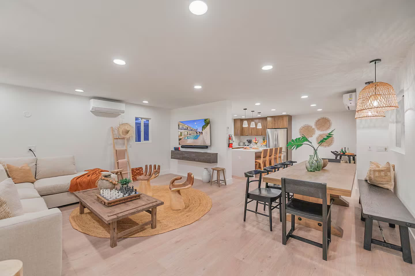 Welcome to The Maya, your exclusive desert retreat in Palm Springs! – Boho-inspired rooms with king-size beds and en-suite bathrooms. – Cozy lounges create a tranquil sanctuary for relaxation. – Family-friendly options with playful bunk beds. – Spacious community room with a sectional, 60-inch TV, and gourmet kitchen. – Fully equipped gym for fitness enthusiasts. – Engaging game room with pool tables and video games. – Stunning views of the desert and mountains.